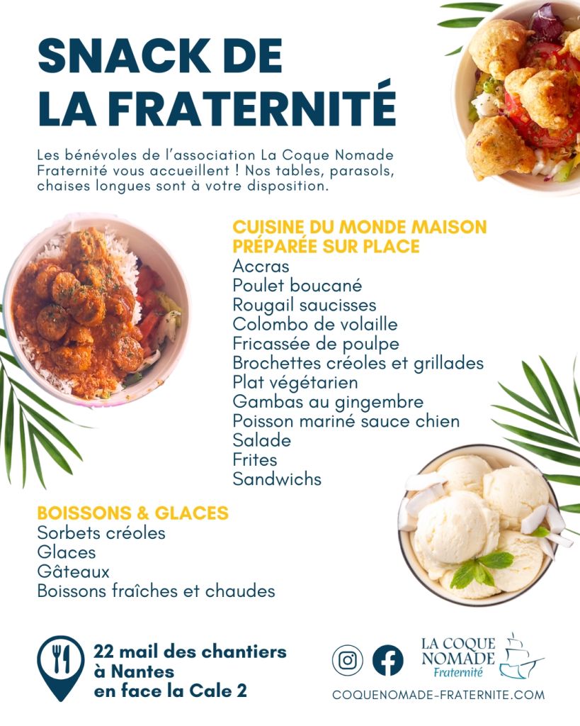 Le Snack permet de financer les projets de l’association la Coque Nomade Fraternité qui agit toute l’année pour une mémoire apaisée de l’esclavage. Nous cherchons plusieurs bénévoles pour assurer en binôme avec un cuisinier la tenue du Snack :